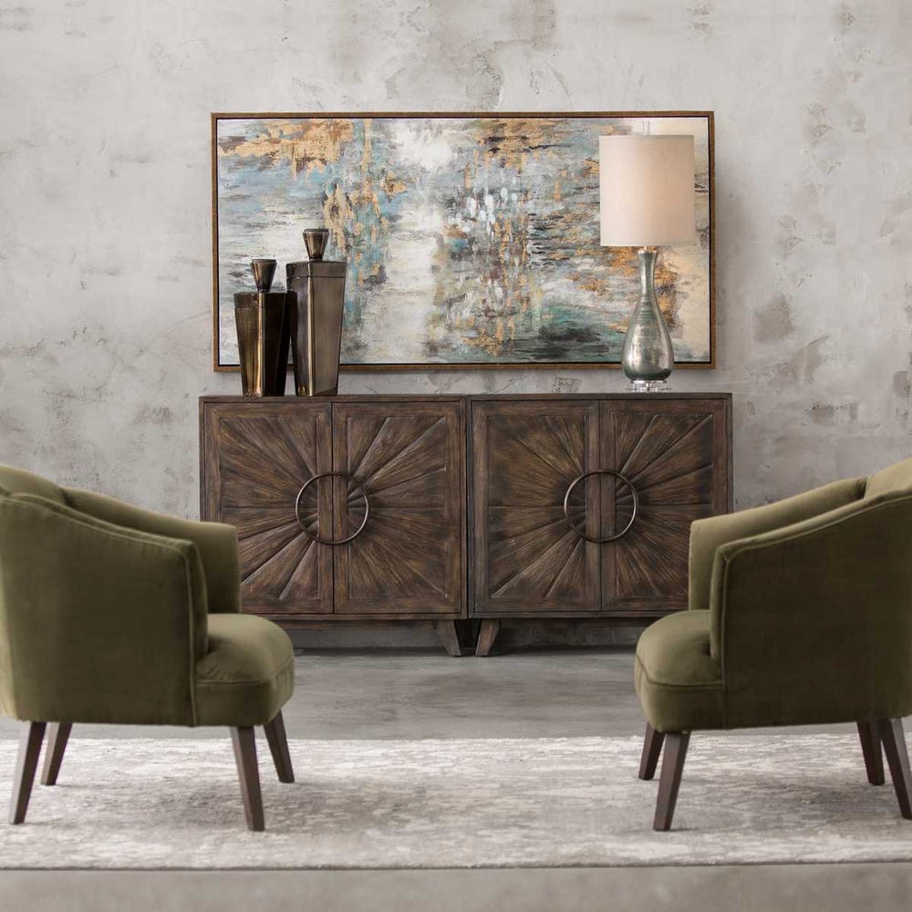 This refined, transitional abstract on canvas showcases expressive brushstrokes with rich fluidity and texture. Soft green, gray, gold, taupe, off-white, and black shades make up this cool-toned piece. Cream-colored areas on each piece feature a sand textured finish. An antiqued copper bronze gallery frame completes the artwork. Due to the handcrafted nature of this artwork, each piece may have subtle differences. This piece may be hung horizontal or vertical.