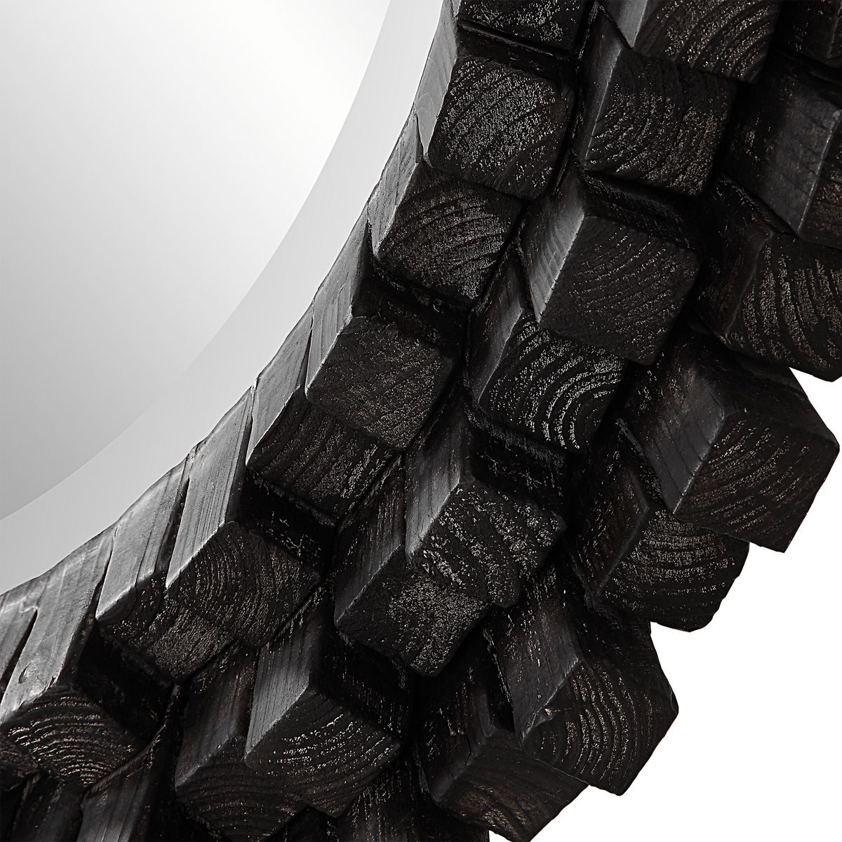 Add bold texture and depth to your interior with this round wood wall mirror, designed to make a striking contemporary statement with rustic character. The frame features angled pillars of solid wood, stacked in alternating heights to create a dramatic, sculptural effect. Finished in a rich ebony stain with a subtle grey wash, the layered texture highlights the natural grain while delivering a refined, modern edge.