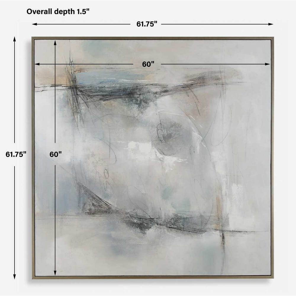 Light and airy shades of gray and sand meet cool blue and green undertones. The hand painted canvas is accented by fine pencil drawings and is paired with a champagne silver frame. Due to the handcrafted nature of this work, each piece may have subtle differences. This piece may be hung horizontal or vertical.