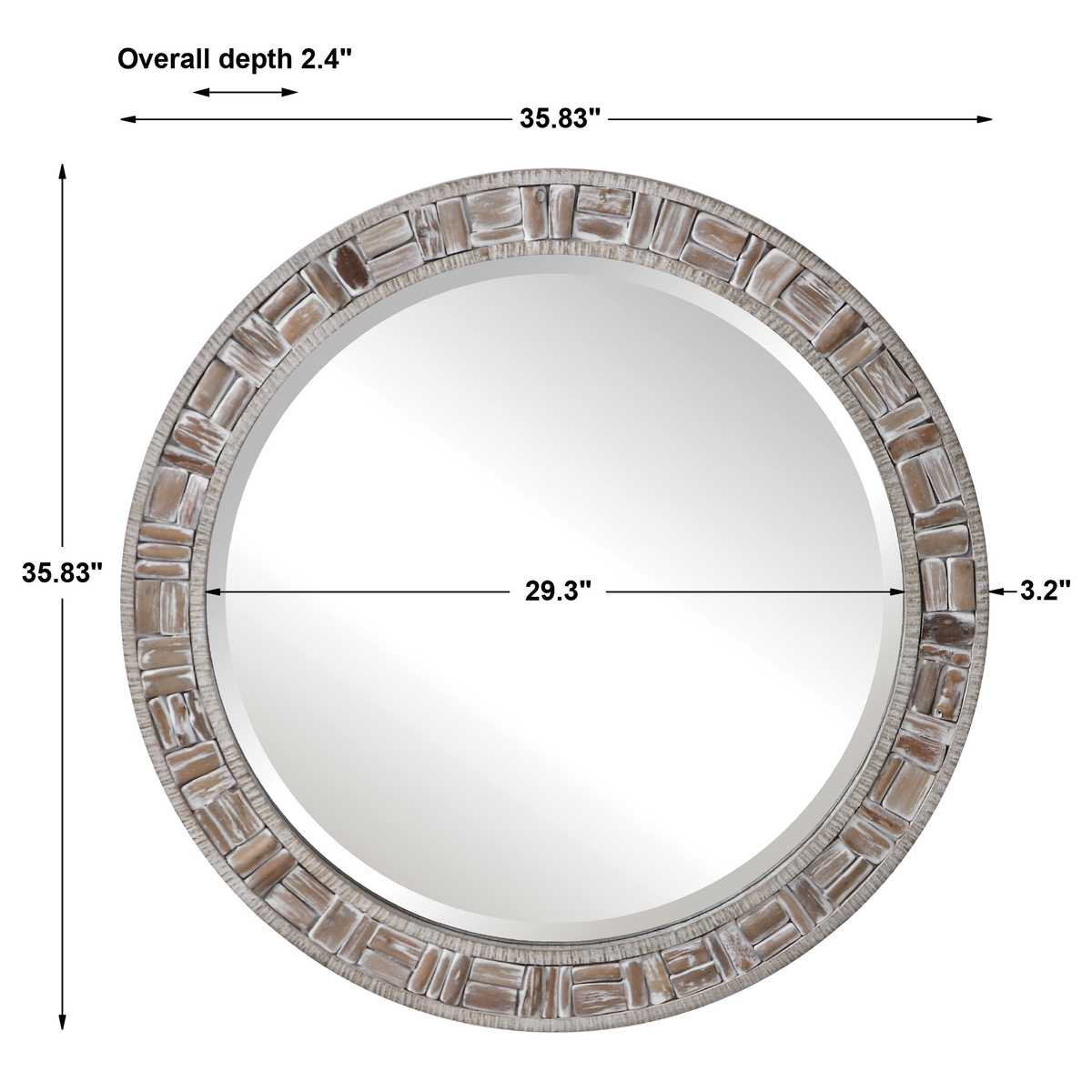 Bring a calm, beach-inspired feel to your home with this coastal-style round wall mirror, beautifully crafted from solid wood with a distinctive pieced driftwood design. Finished in a soft ivory wash, the frame highlights the natural wood grain, adding warmth, texture, and organic character to your space. A generous 1 1/4" bevel enhances depth and reflection, giving the mirror a refined, high-end finish.