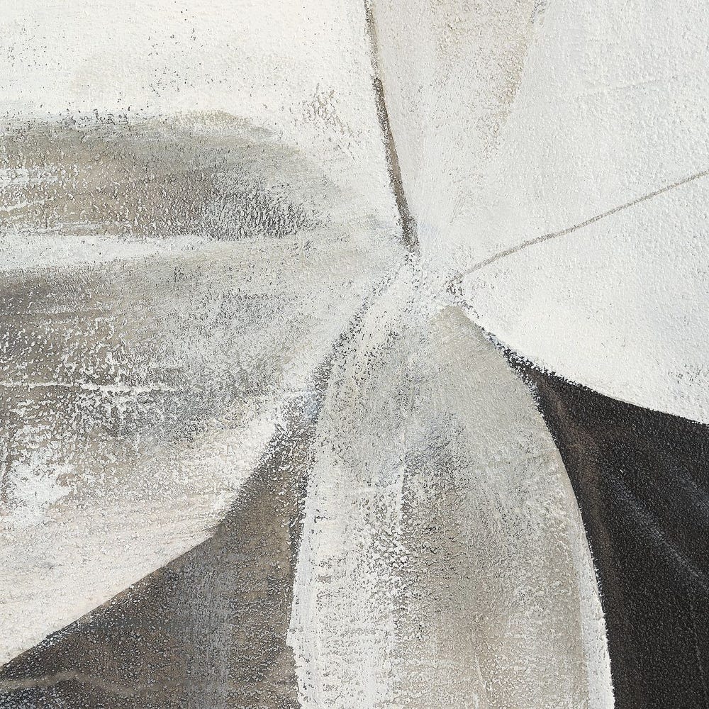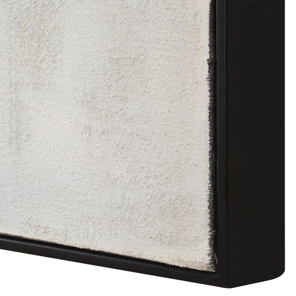 The Folding Time framed canvas features an abstract design with strong geometric influence that evokes the feeling of folded paper, with overlapping and intersecting shapes. The monochromatic color palette is emphasized by a thin, black gallery frame. Due to the handcrafted nature of this work, each piece may have subtle differences. This piece may be hung horizontal or vertical.