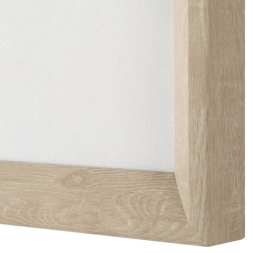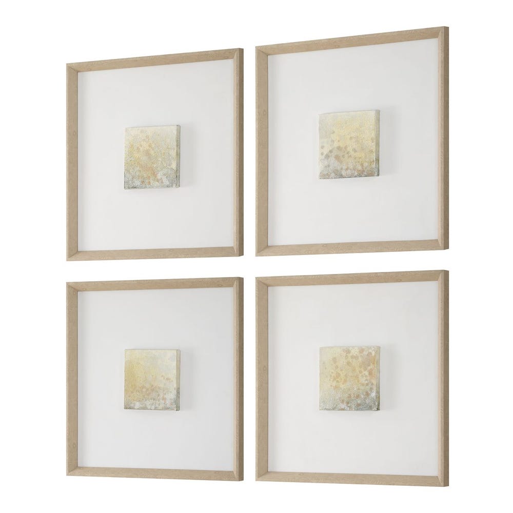 Now & Then is a set of hand painted canvases featuring an abstract composition in tones of gold, beige, ivory, and gray. A smaller painted canvas is inset within a much larger blank canvas, creating a layered effect. A natural pinewood toned frame complements the artwork's subdued palette. Due to the handcrafted nature of this artwork, each piece may have subtle differences.