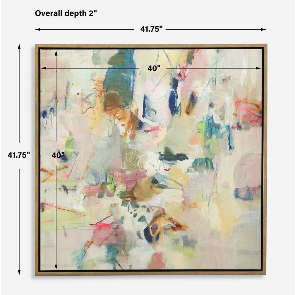 Showcasing a striking blend of bright and neutral color pallets, Party Time giclee on canvas is surrounded by a solid wood frame with gold finish.This piece may be hung horizontal or vertical. Each canvas is proudly handcrafted and printed in the USA. Artwork by Lisa Ridgers.