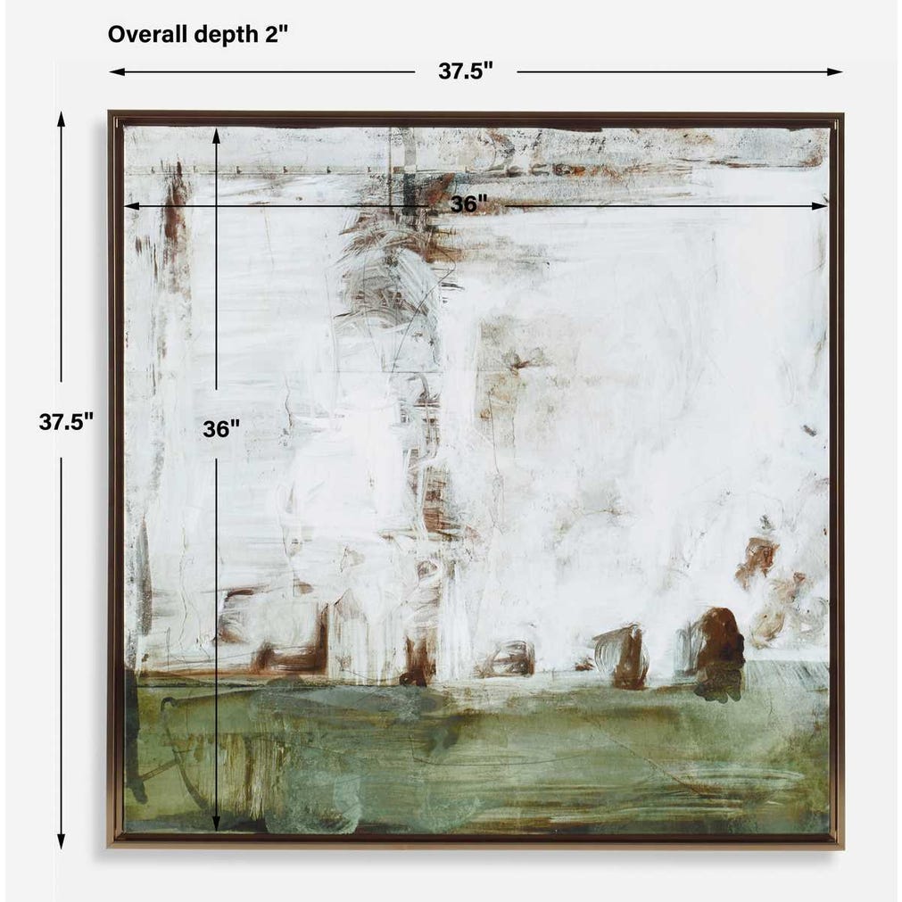 Using shades of olive green, warm umber and bright white, each brushstroke artfully captures the essence of a boardwalk journey. Surrounded by a simple gallery frame in bronze gold finish, this piece may be hung horizontal or vertical. Each canvas is proudly handcrafted and printed in the USA. Artwork by Hayley Michelle.