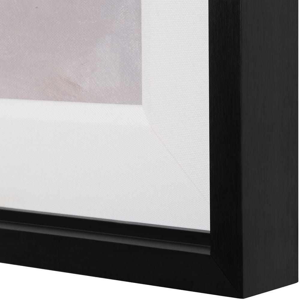 This framed print features a neutral palette of gray, black, and white, accented by vibrant pops of cinnamon that draw the eye and invigorate the composition. Surrounded by a simple black wood grain frame complemented by a crisp white linen liner. Artwork by Silvia Vassileva.